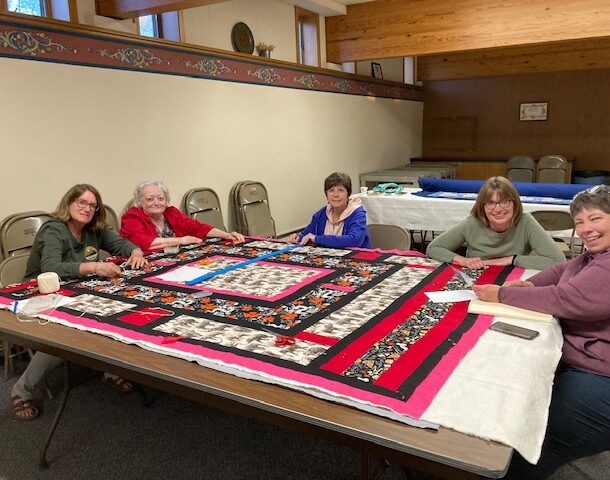 WELCA tying quilt for HS graduate